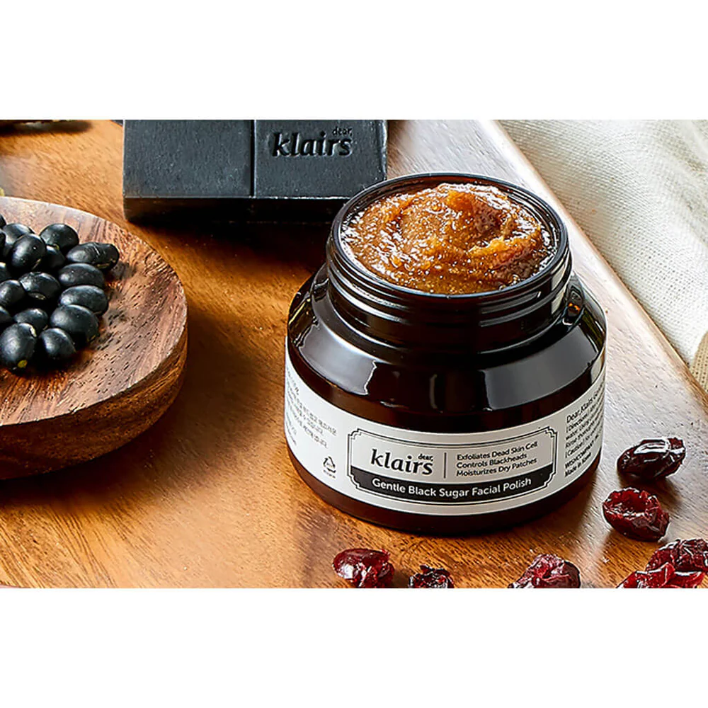 Klairs Gentle Black Sugar Facial Polish 110g is a Korean physical exfoliator made from natural black sugar, plant oils, and butter-based moisturizers. It gently removes dead skin cells, clears clogged pores, and improves overall skin texture.